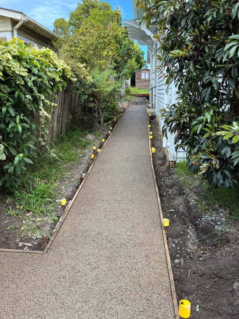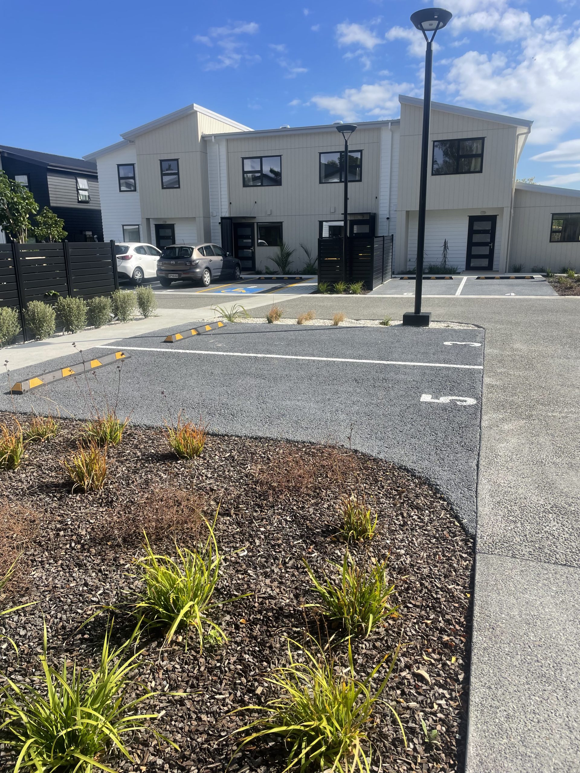 These high-density developments in Palmerston North wanted to minimise their hard surface site coverage, so we installed Permcon permeable concrete for the carparks, with line and descriptor markings painted on as per standard line marking practices!